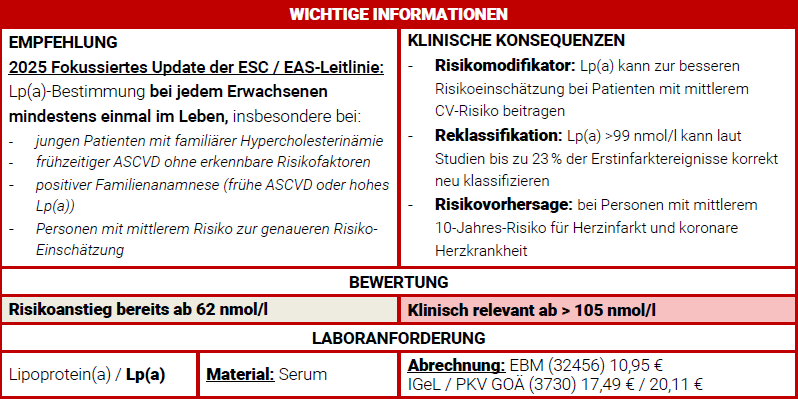 Bereits die ESC/EAS-Leitlinie zum Management der Dyslipidämien 2019 empfahl Lp(a) bei jedem Erwachsenen mindestens einmal im Leben zu bestimmen, um Risikopersonen mit hohem Lp(a)-Spiegel zu identifizieren. Das fokussierte Update 2025 gibt nun an, dass bereits ab einem Lp(a)-Wert von 62 nmol/l das kardiovaskuläre Risiko ansteigt und ab 105 nmol/l klinische Relevanz besteht. Höhere Lp(a)-Werte sind mit stärkerem Anstieg des CV - Risikos assoziiert.